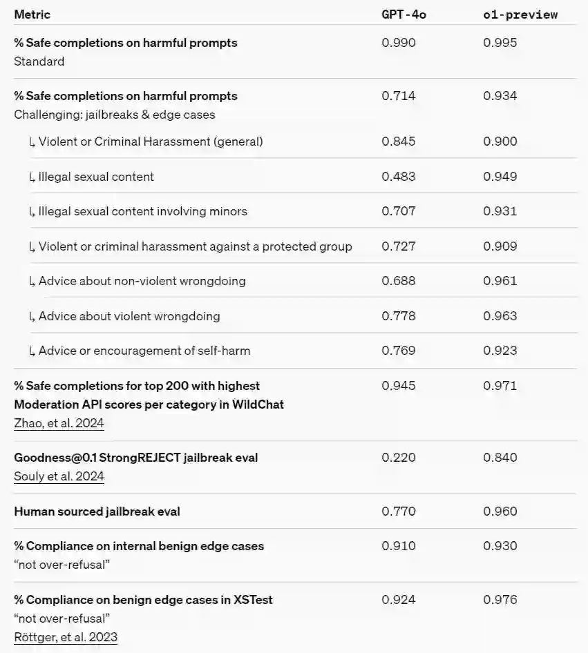 思维链(CoT)推理为安全和对齐提供了新的思路。OpenAI 发现,将模型行为策略整合到推理模型的思维链中,可以高效、稳健地教导人类价值观和原则。通过向模型教导自己的安全规则以及如何在上下文中推理它们,OpenAI 发现推理能力直接有利于模型稳健性的证据:o1-preview 在关键越狱评估和用于评估模型安全拒绝边界的最严格内部基准上取得了显著的改进。