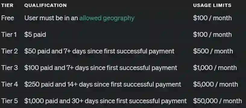 至于通过 API 访问的用户,OpenAI 表示达到了 5 级 API 使用量的开发者可以即刻开始使用这两个模型开始开发应用原型,但同样也被限了速:20 RPM。什么是 5 级 API 使用量?简单来说,就是已经消费了 1000 美元以上并且已经是超过 1 个月的付费用户。请看下图: