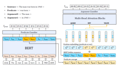 Multi2OIE的体系结构。利用BERT的隐藏状态提取谓词,然后将隐藏序列、谓词的平均向量和位置嵌入连接起来,作为多头注意力块的输入进行参数提取。