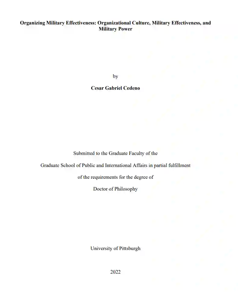 本论文旨在通过跳出系统和国家层面来解释军事效力,使这个问题更加清晰。依靠组织文化理论,作者认为发展正确的组织文化的军队将获得最高水平的军事效力,并在其他情况下获得军事力量。为了确定军队的组织文化,作者分析了军队如何发展自己的作战行动信念,以及这些信念如何形成特定类型的组织文化。然后,通过关注指挥和控制,作者分析了不同的组织文化是如何在二十世纪具有里程碑意义的常规陆战中影响军事效和军事力量的。