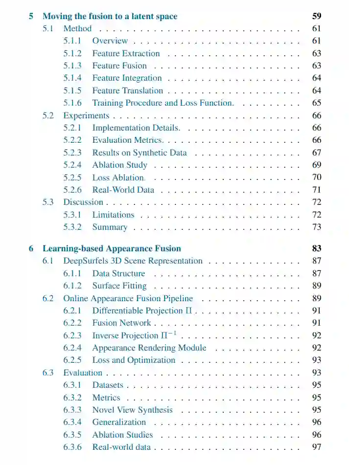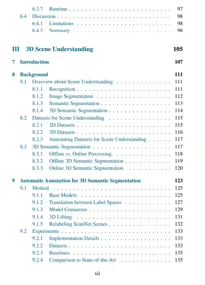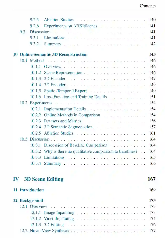 我们正处于一个新技术时代的边缘,技术无缝地融入我们的日常生活。进入这个勇敢的新世界需要始终在线的人工智能和增强现实的融合。然而,我们仍然需要克服许多挑战才能实现这一愿景。这篇论文解决了仍然存在的三个关键挑战:3D重建、3D场景理解和3D场景编辑。增强现实应用要求对世界进行重建,并不断用新信息更新。因此,我们首先解决了在在线系统中逐步融合噪声和异常数据的挑战。我们从数据驱动的角度出发,利用学习到的场景表示,通过机器学习的力量提高现有方法的效率。然而,仅有空间意识是不够的。因此,我们转向3D场景理解,我们面对为3D语义分割模型注释数据集的高成本挑战。我们引入了一个自动化的语义注释流程,达到人类注释质量,将最先进模型的预测统一到一个共享的标签空间中,并通过3D提升进一步改进。此外,我们将在线重建流程扩展到语义映射,通过一个时空注意力机制克服有限的接收字段问题,这个机制有效地结合了2D和3D以及过去的信息。在最后部分,我们探索了使用神经辐射场进行3D场景编辑。因此,我们提出了一种方法,利用在强大的2D修复方法中编码的先验知识来移除场景中的对象。这需要在优化阶段设计一个基于信心的视图选择机制,以确保最终重建中的多视图一致性。