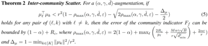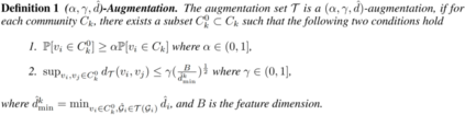 该定理建立了表示的社区内集中程度与 中正例对对齐程度间的关系。具体地,社区内集中需要较小的 。对比学习优化框架正是缩小正例对间的距离,因而 GCL 满足要求。 接下来,我们证明 GCL 还具有社区间分散的特性。对于增广集 ,将两节点间的增广距离定义为其变换前表示的最小距离, 其中 是增广后的邻接矩阵 的第 行, 为增广后的度。基于增广距离,我们引入 -augmentation 的定义用于衡量变换前表示的集中程度。