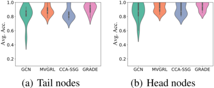10次独立实验的平均值和标准差如上表所示。在大多数情况下,GRADE 优于所有基线方法。GRADE 在 Cora 和 Citeser 数据集上的提升更显著,因为这两个数据集的平均节点度约为 3,存在大量尾节点。为验证 GRADE 在提高尾节点分类性能的同时保留了头节点的性能,我们根据阈值 将 Cora 的测试节点分为尾节点和头节点,并在小提琴图中绘制其平均准确率。正如预期,无论尾节点还是头节点,GRADE 都有较明显的性能提升。