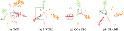 为证明 GRADE 使社区更集中,我们可视化了 Cora 数据集上 GRADE 和基线的节点表示。以蓝色社区为例,图对比学习基线虽比 GCN 有更清晰的社区边界,但蓝色节点仍很分散。在 GRADE 中,它们聚集在一起,说明增广策略发挥了重要作用。 更多实验,请参考原文。