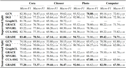 我们将 GRADE 与最具代表性的 GCL 模型 DGI、GraphCL、GRACE、MVGRL 和 CCA-SSG 进行比较,并同时评估半监督 GCN 以供参考。对于 GCL 模型,每个模型以无监督方式进行训练后,所得节点表示喂入逻辑回归分类器,并采用常见的两种划分方式进行评估:1)半监督划分,每类 20 个标记节点用于训练,1000 个节点用于测试;2)监督划分,1000 个节点用于测试,其余节点用于训练。GCN 同样遵循上述划分进行训练。