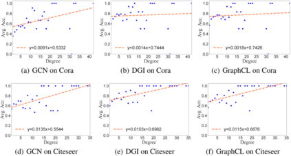 选取两个具有代表性的 GCL 模型 DGI[2]和 GraphCL[3],分析其结构公平性。具体地,我们将GCN、DGI 和 GraphCL 分别在 Cora、Citeseer、Photo 和 Computer 数据集上训练,并根据度将节点分组,计算这些组的平均准确率,如图所示。为进一步反映结构公平性,我们用线性回归拟合这些散点,斜率越小,该模型对度偏差越公平。Photo 和 Computer 数据集上的实验结果,参见论文。从图中可以看出,DGI 和 GraphCL 尾节点的平均准确率高于 GCN,且回归线的斜率也较小。这一有趣的现象说明,无监督的 GCL 方法比半监督的 GCN 更具有结构公平性。