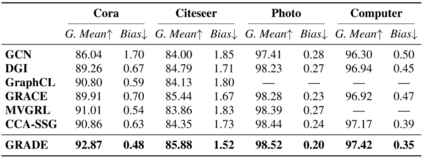 基于这些指标,评估结果如下表所示。可以看出,GRADE 降低了所有数据集的偏差,并保持最高的组平均。