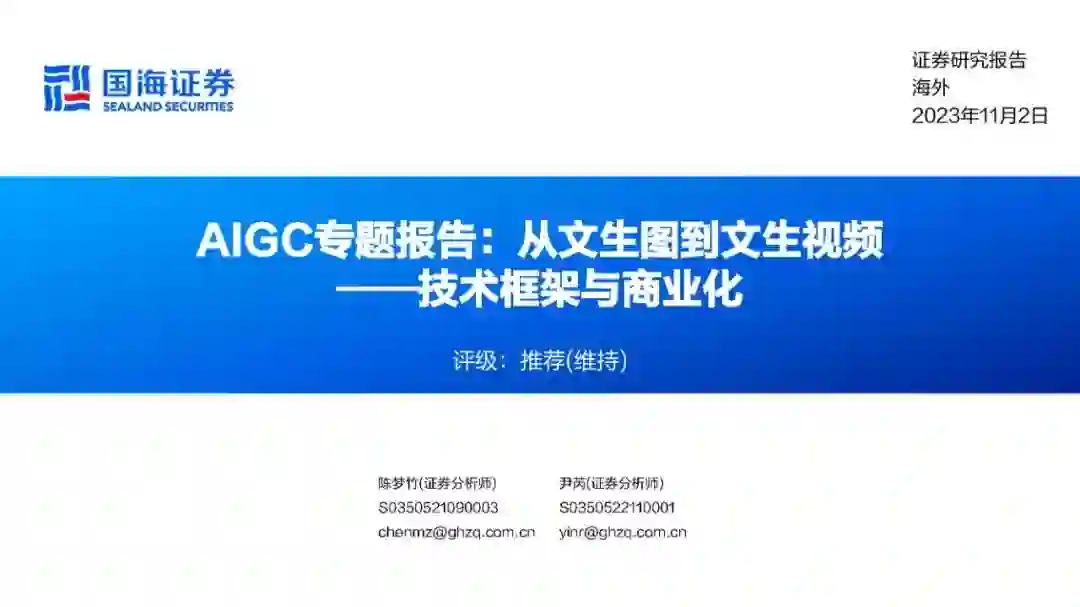 文生图和文生视频的底层技术框架较为相似,主要包括GAN、自回归和扩散模型三大路径,其中扩散模型(Diffusionmodel)为当前主流生成模型,多个指标对比下综合占优,能在较为可控的算力成本和较快的速度下生成具备多样性、高质量的图像:①图像质量:扩散模型>自回归模型>GAN模型。FID值(FréchetInceptionDistancescore)是用于评估模型生成的图像质量的指标,是用来计算真实图像与生成图像的特征向量间距离的一种度量。FID值越小,可以认为图像质量在一定程度上越优。从不同模型的FID得分来看,扩散模型平均数较小,反应图像质量较高。②参数量:自回归模型>扩散模型>GAN模型。GAN的参数量一般在千万级别,整体较为轻巧,扩散模型的参数量在十亿级别,自回归模型在十亿到百亿级不等。③生成速度(由快到慢):GAN模型>扩散模型>自回归模型。生成速度与参数量级为负相关关系。④训练成本:自回归>扩散模型>GAN模型。由于参数量级较小,GAN模型训练成本小且开源模型多,仍具备一定优势。而自回归模型参数量级较大,整体训练成本更高。在单张A100GPU下,120亿参数的DALL-E需要18万小时,200亿参数的Parti更是需要超过100万小时,扩散模型参数量在十亿级别,整体训练成本较为适中。