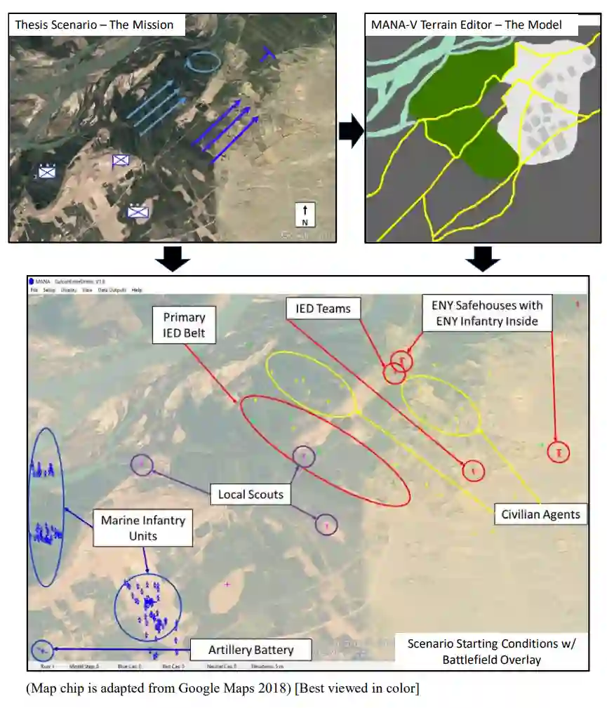 作者使用 ABS 建模环境 MANA-V 创建了一个逼真的战场,并恰当地捕捉到了蜂群的复杂性和自主性。论文中的场景是作者在支持 "持久自由行动 "时经历的实际任务设置。模拟逼真地描述了一个具有挑战性的混合威胁,其目的是阻止美军进入敌方据点。此外,无人机群是以 ARSENL C2 架构为模型的。本研究以 ARSENL 架构和作者的作战经验为基础。