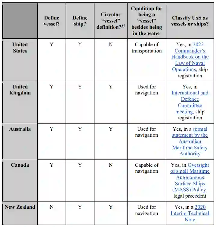 与本分析相关的研究包括大量法律和政策,从条约到军事手册,再到船舶登记条例。在本报告中,当 "船舶 "或 "船只 "一词被纳入由负责该领域的监管机构颁布的、广泛适用于其沿海水域、领海或专属经济区的法律或政策(如《美国法典》、《2001 年加拿大航运法》等)时,国家即对该词进行了定义。具体条约通常有狭义的定义,只有在其特定背景下才有意义,不一定能明确无证运输的法律待遇。鉴于各国对 UxS 的处理含糊不清,需要采用更广泛的方法来研究这个问题,包括研究各种文件和声明,以衡量各国对 UxS 作为船舶或船只的地位的立场。