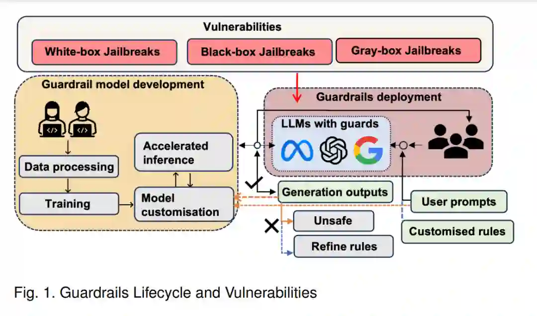 像安全关键软件一样,需要一个系统化的过程来涵盖开发周期(从规范、设计、实施、集成、验证、确认到生产发布),以谨慎地构建护栏,如ISO-26262和DO-178B/C等工业标准所示。本综述从第2节的一些背景介绍开始。目标是(1)了解现有的护栏框架,这些框架用于控制LLM服务中的模型输出,以及评估、分析和增强护栏以应对特定理想属性的技术(第3节);(2)了解用于克服这些护栏的技术,以及防御攻击和强化护栏的技术(第4节);然后讨论如何实现完整的护栏解决方案,包括为特定应用背景设计护栏的一些系统化设计问题(第5节)。
