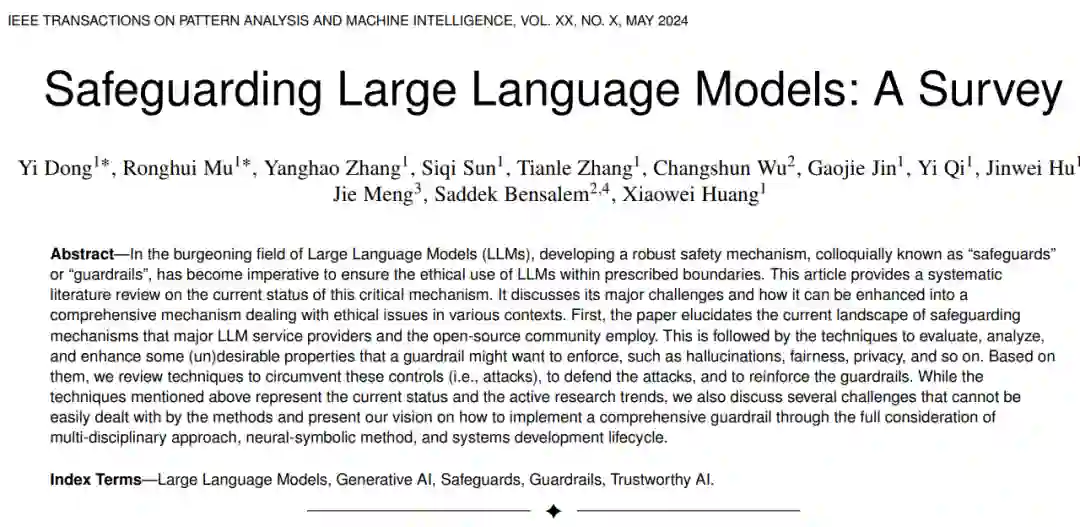 在蓬勃发展的大型语言模型(LLMs)领域,开发一种健全的安全机制,也就是俗称的“保护措施”或“护栏”,已成为确保LLMs在规定范围内伦理使用的当务之急。本文对这一关键机制的当前状态进行了系统的文献综述。文章讨论了其主要挑战,并探讨了如何将其增强为一个全面的机制,以应对各种情境下的伦理问题。首先,本文阐明了主要LLM服务提供商和开源社区所采用的现有保护机制的现状。接着,本文介绍了评估、分析和增强护栏可能需要执行的一些(不)理想属性的技术,例如幻觉、公平性、隐私等。在此基础上,我们回顾了绕过这些控制(即攻击)、防御攻击以及强化护栏的技术。尽管上述技术代表了当前的状态和活跃的研究趋势,我们还讨论了一些不能轻易用这些方法处理的挑战,并提出了我们对如何通过充分考虑多学科方法、神经-符号方法和系统开发生命周期来实现全面护栏的愿景。