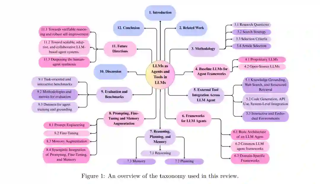 系统性综述 LLMs 作为智能体与工具使用者的最新进展,提出了一个显式的分类体系,描述其架构、框架与交互范式; * 探讨 LLM 的推理、规划与记忆能力,并分析提示、微调与记忆增强如何提升智能体性能; * 批判性回顾当前 LLM 智能体与工具使用者的评估方法与基准; * 识别对齐性、可靠性与泛化性等核心挑战,并提出若干研究路径,以提升 LLM 智能体的鲁棒性与智能水平。