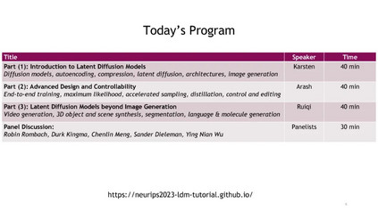 在本教程中,我们旨在提供LDMs的介绍。虽然扩散模型的文献已经很广泛,但LDM范式由于其灵活性以及在性能和计算需求之间的出色权衡而特别突出。我们的目标是呈现一个LDM教程,有助于对高效且灵活但富有表现力的生成模型框架感兴趣的研究者。我们还将强调加速采样和可控性的高级技术,并讨论LDMs在图像合成之外的各种应用。此外,一个小组讨论将提供这一动态领域的多元视角,并为未来对LDMs的研究提供展望。 本教程专注于潜在扩散模型。对于扩散模型的一般教程,我们推荐参考在CVPR'22和CVPR'23上展示的、已录制并公开可用的教程。