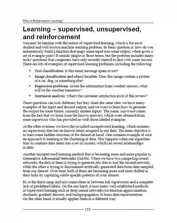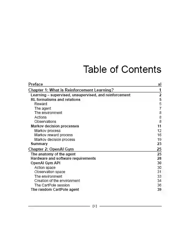 Chapter 2: OpenAI Gym * Chapter 3: Deep Learning with PyTorch * Chapter 4: Cross Entropy method * Chapter 5: Tabular learning and the Bellman equation * Chapter 6: Deep Q-Networks * Chapter 7: DQN extensions * Chapter 8: Stocks trading using RL * Chapter 9: Policy Gradients: an alternative * Chapter 10: Actor-Critic method * Chapter 11: Asynchronous Advantage Actor-Critic * Chapter 12: Chatbots traning with RL * Chapter 13: Web navigation * Chapter 14: Continuous action space * Chapter 15: Trust regions: TRPO, PPO and ACKTR * Chapter 16: Black-box optimisation in RL * Chapter 17: Beyond model-free: imagination * Chapter 18: AlphaGo Zero