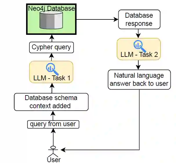 在多种图数据库中,本研究聚焦Neo4j数据库及其Cypher查询语言[6]。“Cypher查询语言”(CQL)是专为图结构设计的成熟查询语言。现有研究主要集中于利用LLMs实现自然语言到Cypher代码的映射[7]–[11],当前多数LLMs均具备CQL处理能力。本工作核心目标是构建人机数据库交互界面:1)自然语言问题转为数据库查询 2)将数据库输出与原始问题结合生成自然语言响应。该系统设想将实时IoBT数据存入设备或邻近网络数据库,作战人员可直接用自然语言查询。LLMs先将问题转译为Cypher查询语句,返回结果再与原始问题融合生成最终响应,为非专业用户提供高效IoBT数据访问通道。