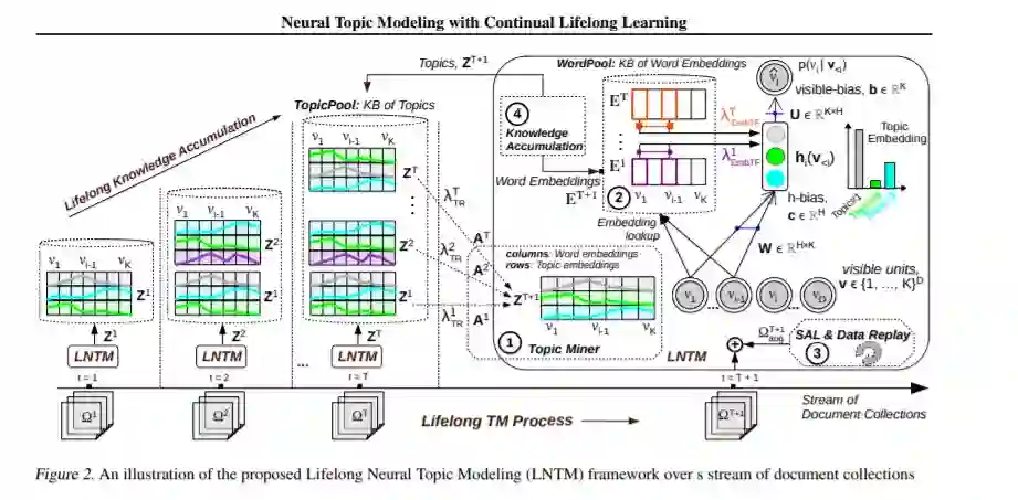 最近,终身学习在构建不断积累和转移知识以帮助未来学习的机器学习系统方面引起了关注。无监督主题建模广泛用于从文档集合中发现主题。然而,由于数据稀疏性,例如,在一个小的(短)文档集合中,会产生不连贯的主题和次优的文档表示,主题建模的应用具有挑战性。为了解决这个问题,我们提出了一个神经主题建模的终身学习框架,它可以连续处理文档集流,积累主题,并通过从多个来源的知识转移来指导未来的主题建模任务,以更好地处理稀疏的数据。在终身学习过程中,我们特别共同研究:(1)终生共享生成同源性(潜在话题)以转移先验知识,(2)通过新颖的选择性数据增强、联合训练和话题正则化方法最小化保留过去学习的灾难性遗忘。在给定一个文档集合流的情况下,我们应用所提出的终身神经主题建模(LNTM)框架,将三个稀疏文档集合建模为未来任务,并通过perplexity、Topic coherence和information retrieval task量化,证明了性能的提高。