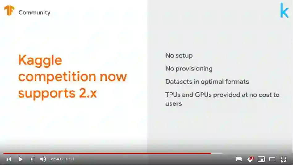 目前Kaggle比赛也开始支持TF 2.x,并为用户提供免费的TPU和GPU: