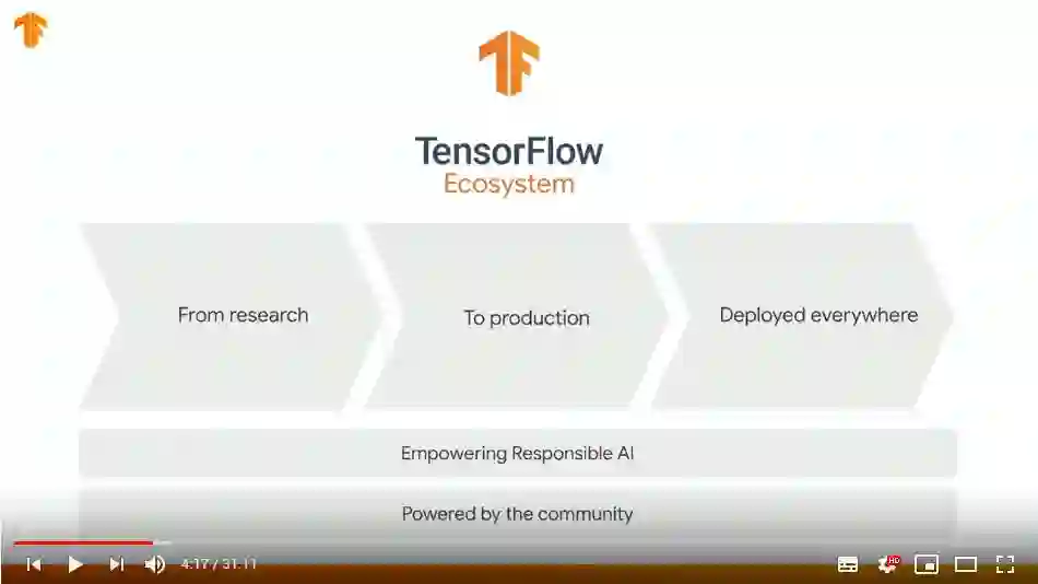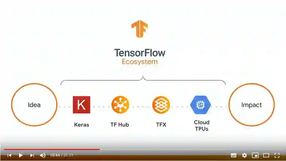 通过Keras、TF Hub、TFX、Cloud TPUs等组件的支撑,使得我们可以在各种量级的工业产品中轻松地使用TF来落地各种想法: