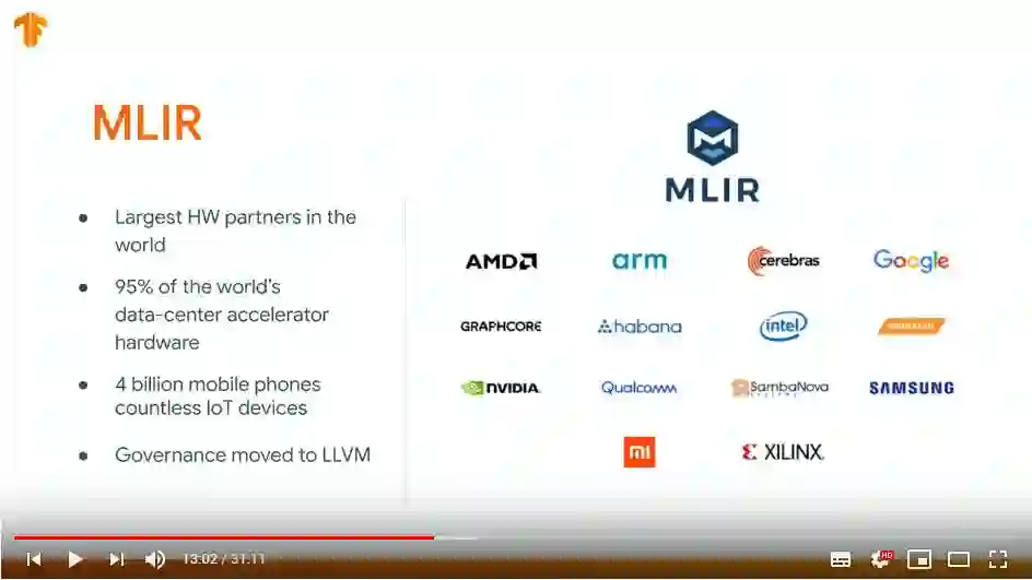 MLIR是TF和其它深度学习框架的编译基础设施,它是工业界AI的通用解决方案之一,支持大部分的加速硬件: