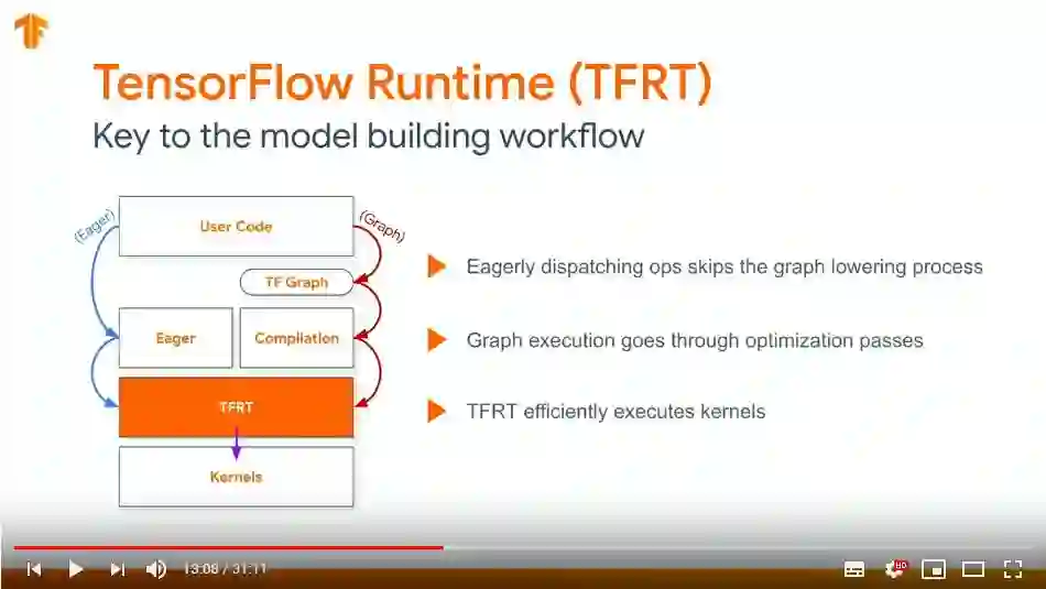 新的TensorFlow 运行时(TFRT)为开发者提供了底层的基础设施。开发者并不需要直接操作TFRT,作为基础设置,TFRT使得我们可以在各种硬件上开发出高性能的TF应用。
