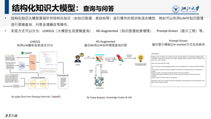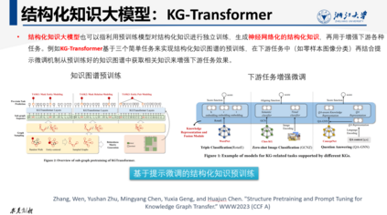 结构化知识大模型也可以指利用预训练模型对结构化知识进行独立训练,生成神经网络化的结构化知识,再用于增强下游各种任务。例如KG-Transformer基于三个简单任务来实现结构化知识图谱的预训练,在下游任务中(如零样本图像分类)再结合提示微调机制从预训练好的知识图谱中获取相关知识来增强下游任务效果。 一些研究表明,现有大模型在处理天然依赖结构化数据的任务方面,除查询问答类因为依赖自然语言生成结构化查询表现较好以外,其他例如链接预测、关联挖掘、子图分析、时序预测等任务仍然无法超过传统小模型。但大模型的知识预先训练、指令驱动的泛化能力、奖励模型与对齐学习等思想均可用来增强结构化知识的处理能力。我们可以通过设计更加适合编码结构化知识的基础模型训练机制、通过将结构化数据指令化实现指令驱动的结构化任务处理、面向结构化数据任务的奖励模型等,提高大模型分析和处理结构化知识的能力,这对于很多依赖结构化数据的大数据分析类应用领域具有重要价值。