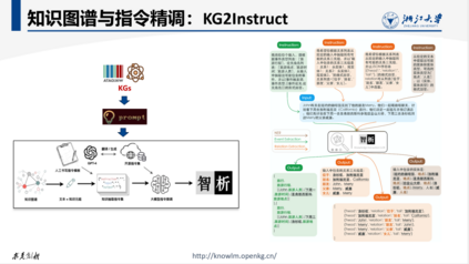指令精调是指在预训练模型的基础之上,通过将任务特定的监督数据转化为指令或提示形式,进一步训练和微调以提升模型的性能和准确性。由于各种不同任务的数据都以统一的指令形式输入到模型进行训练,这使得模型具有更好的任务泛化能力,即解决新问题或完成新任务的能力。知识图谱中的知识可用来增强指令提示或直接用于生成指令数据集。例如,知识图谱中的实体属性和关联信息可以用于丰富指令的上下文信息。通过查询知识图谱,可以获取实体之间的关联和属性,并作为提示工程的一部分。 下图展示了一个利用知识图谱直接构建知识抽取指令的例子。该模型基于KG2Instructions技术产生的大量指令数据来提高语言模型对于人类抽取指令的理解。具体基于维基百科和WikiData知识图谱,通过远程监督、Schema约束过滤等方法构建大量的指令数据,并通过随机采样人工指令模板的方式提升指令的泛化性。