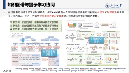 知识图谱可与提示学习机制相结合。下面这篇工作是我们团队今年发表在Nature机器智能子刊上的文章:“Knowledge graph-enhanced molecular contrastive learning with functional prompt.”。文中介绍的KANO模型一方面利用基于维基百科构建的化学元素知识图谱来增强分子图的表示,另外一方面将官能团作为提示变量来提示模型激活官能团相关的参数。