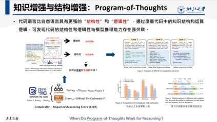 为进一步探索代码结构与推理能力之间的关联关系,我们开展了一项“Program of Thoughts”的研究工作。我们首先定义了一些衡量代码结构性和逻辑性的指标,以此来衡量不同形式代码中的结构性知识的丰富程度。例如,一个包含复杂循环逻辑的代码比简单的变量赋值包含更丰富的运算逻辑,因此其结构性和逻辑性得分更高。然后我们把这些结构性不同的代码作为prompt来驱动模型的问答,并对其推理结论的正确性比例进行分析。在多个测试数据集上的实验分析表明,结构性和逻辑性更强的代码提示更加有助于激活模型的推理能力。