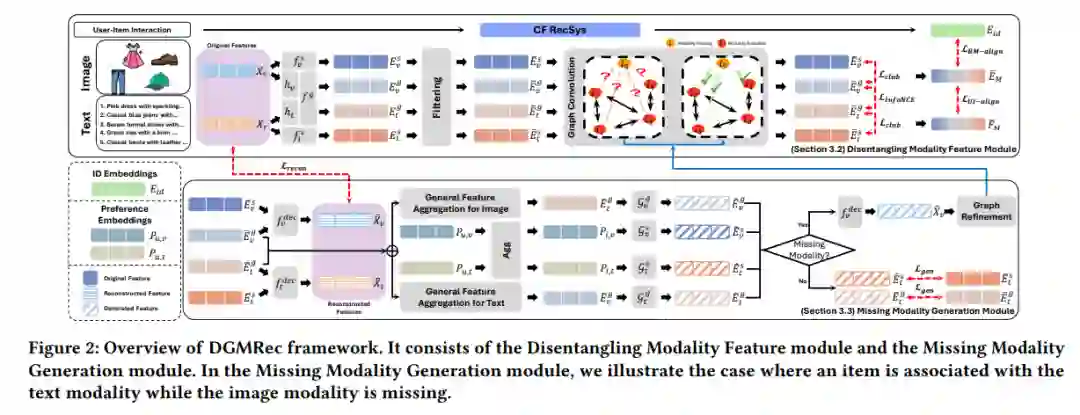 1)对缺失模态场景考虑不足; 2)忽视模态特征的独特性。这些问题导致在实际场景中,当某些模态缺失时,推荐系统的性能显著下降。为了应对这些问题,我们提出了解耦与生成推荐模态(DGMRec),这是一种针对缺失模态场景的新型框架。DGMRec从信息角度出发,将模态特征解耦为通用模态特征和特定模态特征,从而为推荐提供更丰富的表示。在此基础上,它通过整合其他模态的对齐特征和利用用户模态偏好生成缺失的模态特征。大量实验表明,DGMRec在具有挑战性的场景中(包括缺失模态、新项目设置、不同缺失比例和模态缺失的不同级别)始终优于现有的最先进的MRS。此外,DGMRec的基于生成的方法使得跨模态检索成为可能,这在现有的MRS中是不可行的,突显了其适应性和在现实应用中的潜力。我们的代码已发布在https://github.com/ptkjw1997/DGMRec。
