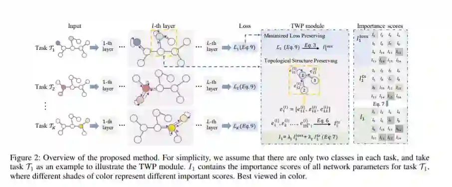 灾难性遗忘是指神经网络在学习新任务时“忘记”之前所学知识的倾向。以往的方法在克服这一问题上主要集中在卷积神经网络(CNNs),图像等输入样本位于一个网格域中,但在很大程度上忽略了处理非网格数据的图神经网络(GNNs)。在本文中,我们提出了一种新的方法来克服灾难性遗忘问题,从而加强网络中的持续学习。我们的方法的核心是一个通用模块,称为拓扑感知权值保持~(TWP),以即插即用的方式适用于任意形式的GNNs。主流的基于CNN的连续学习方法只依赖于减慢对下游任务很重要的参数的更新速度,而TWP不同于这种方法,它明确地探索了输入图的局部结构,并试图稳定在拓扑聚合中起关键作用的参数。我们在几个数据集上评估了TWP在不同GNN骨干上的性能,并证明了它产生的性能优于目前的技术状态。