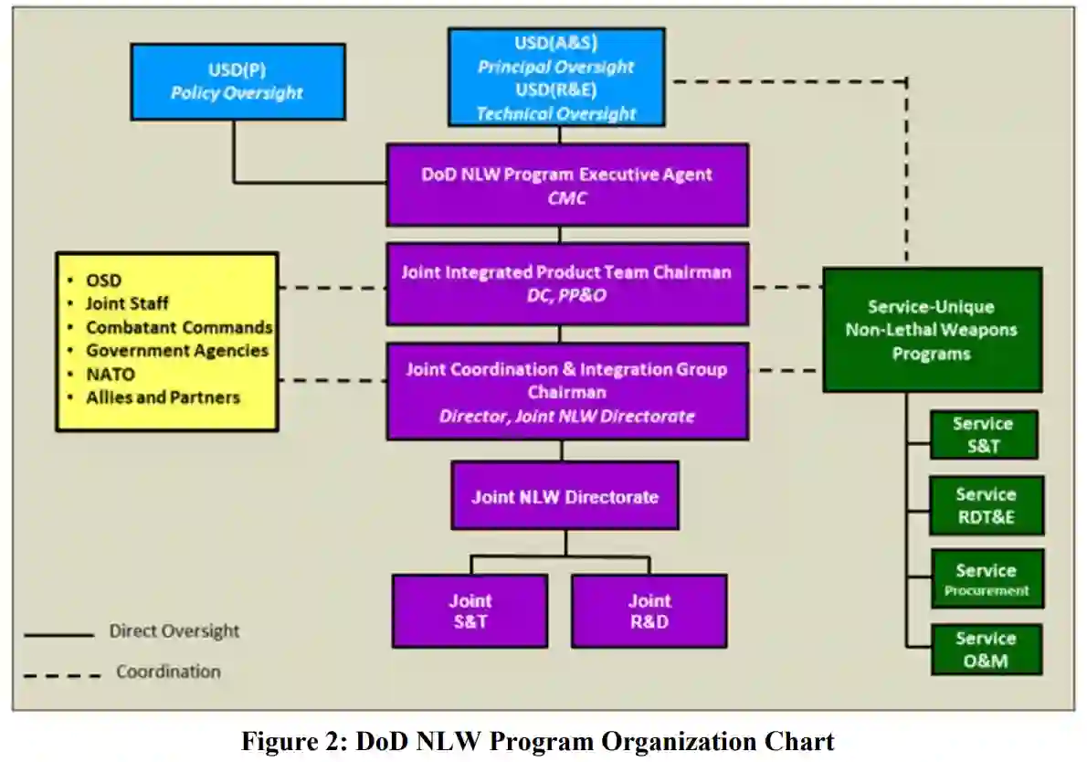 作为美国防部(DoD)非致命武器(NLW)的执行代理人,戴维·h·伯杰(美国海军陆战队司令)是非致命武器事务的协调人。对非致命武器的持续研究、开发和投资--被描述为 "中间部队能力"--将提高我们应对整个冲突过程中的挑战的能力。