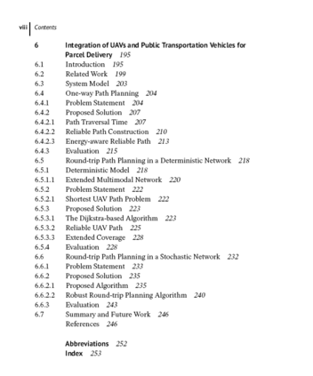 在第六章中,我们讨论了无人机在最后一英里快递中的应用。无人机由于降低成本和增加机动性,被许多企业认为是未来物流行业的有前途的工具。然而,由于机载电池的限制,飞行时间有限是一个障碍。本章介绍了利用公共交通工具辅助无人机配送的最新研究成果。重点研究了无人机与公共交通工具协同飞行时的路径规划问题,提出了几种算法来解决不同情况下的路径规划问题。