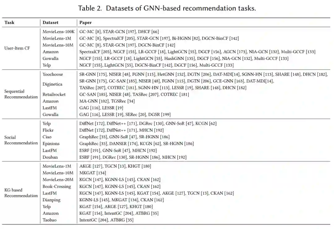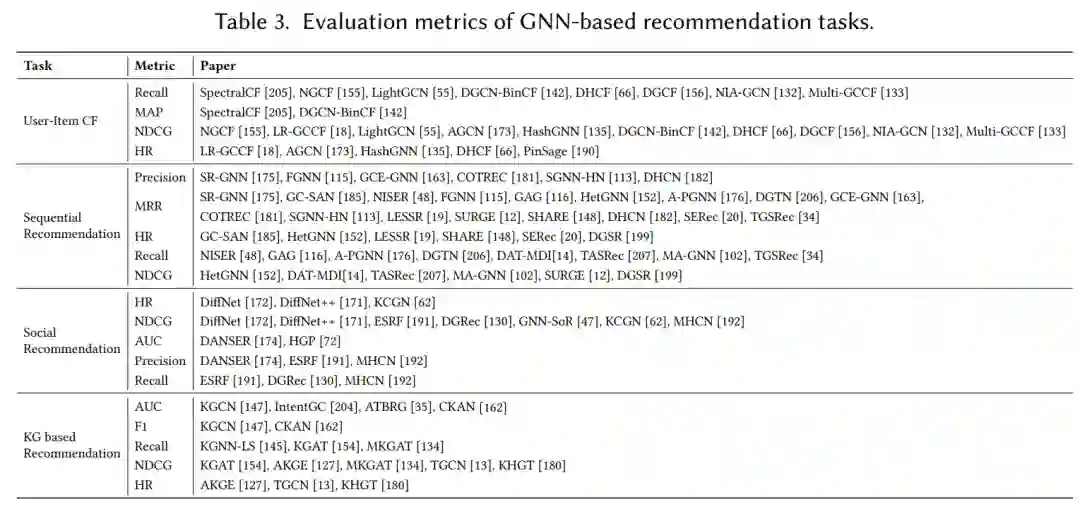 我们介绍了针对不同推荐任务的常用数据集和评估指标,并总结了基于 GNN 的推荐的实际应用。本节可以帮助研究人员找到合适的数据集和评估指标来测试他们的方法,并概述基于 GNN 的推荐的实际应用。