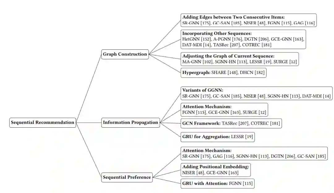 哪一种 propagation 机制更好?是否有必要区分序列的顺序?大多数信息传播方法是传统的GNN方向中传播方式的变体,对于哪种方法更好还没有共识。一些复杂的传播方法,例如 LESSR,以更多的计算为代价实现了性能提升。在实践中是否采用复杂的传播方法取决于计算成本和性能增益之间的权衡。