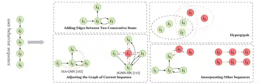 最直接的构造是在两个连续项目之间添加边。当序列长度较短时,利用附加序列可以丰富序列图,如果附加序列与原始序列更相似则更好。另一条线是调整行为序列的图结构。关于哪种方法更好,没有公认的说法。此外,序列和序列之间的关系图也被用来获得进一步的改进。