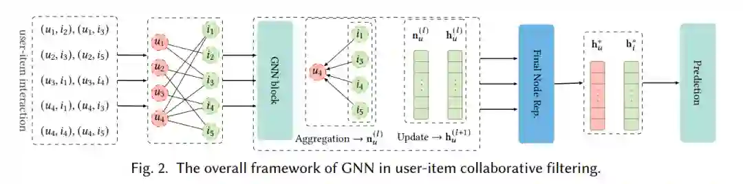 随着在线信息的爆炸式增长,推荐系统在缓解这种信息过载方面发挥着关键作用。由于推荐系统的重要应用价值,该领域一直有新兴的工作。在推荐系统中,主要挑战是从交互和辅助信息(如果有的话)中学习有效的用户/项目表示。最近,图神经网络(GNN)技术在推荐系统中得到了广泛的应用,主要原因有以下三点:(1)推荐系统中的大部分信息本质上都具有图结构,而 GNN 在图表示学习方面具有优势;(2)从图结构的角度,不同的数据类型信息可以采用统一的框架建模;(3)GNN通过多层网络传递信息,可以显式地编码用户交互行为中的高阶信号。本文基于推荐过程中使用的信息类型和推荐任务对现有工作进行分类,分别为用户-项目协同过滤,序列推荐,基于社交网络的推荐,基于知识图谱的推荐,以及其他任务。对于每个类别,我们总结了主要挑战,介绍了代表性模型并说明了它们如何解决这些问题。每一章的最后对现有工作的优点和局限性展开了讨论。本文总结了主流基准数据集、广泛采用的评估指标,并简述了实际应用。此外,我们阐述了9个该领域有待进一步研究的方向。