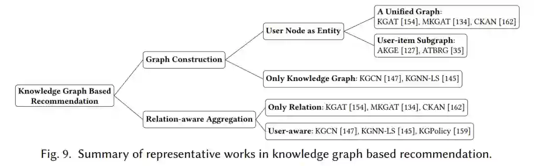 如何聚合 user-item interactions 和知识图谱中的语义信息?是否显式地将用户节点放入知识图谱或是隐式地使用用户表征来区分不同关系的重要程度?现有工作要么将用户节点视为一种实体,要么隐式使用用户节点来区分关系。第一个方向可以进一步分为整体统一图或用户-项目对的特定子图。与整体统一图相比,user-item子图的优势在于关注更多相关的实体和关系,但需要更多的计算时间,性能取决于子图的构建,这还需要进一步研究。