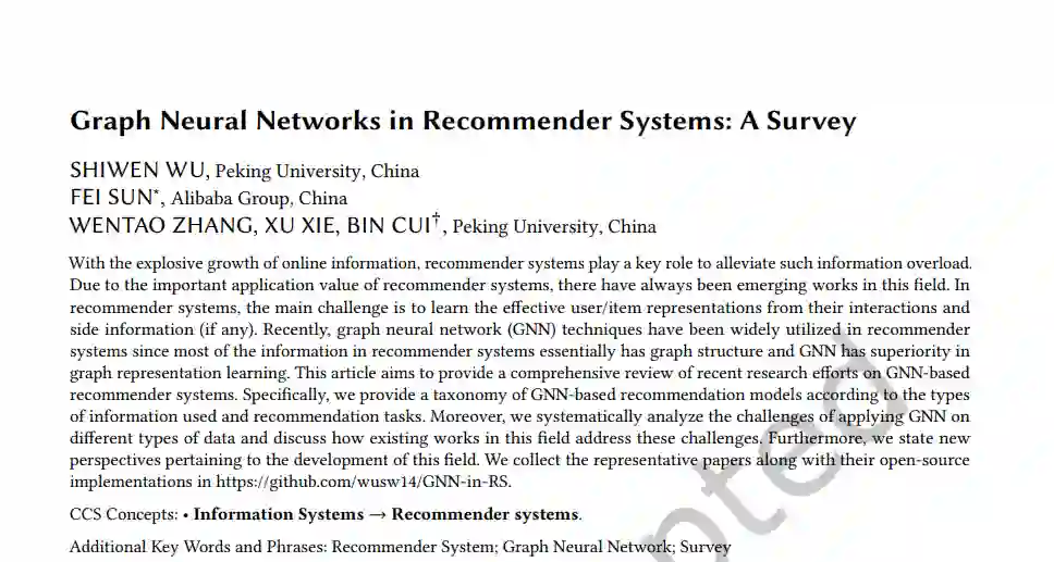 综述中提及的代表性工作及其对应的开源实现:https://github.com/PKU-DAIR/GNN-in-RS 本文作者: SHIWEN WU, Peking University, China FEI SUN∗ , Alibaba Group, China WENTAO ZHANG, XU XIE, BIN CUI† , Peking University, China 论文链接:https://dl.acm.org/doi/abs/10.1145/3535101