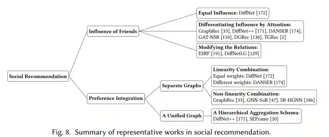 用户涉及两种类型的关系,即与朋友的社会关系和与项目的交互。如何从社会影响角度和交互行为整合用户表征?整合两种信息源的策略取决于是分别考虑这两个图还是将它们统一为一个图。对于单独的图,用户偏好是从这两个图中学习的整体表示的集成。对于统一图,通常采用的策略是分层聚合模式。