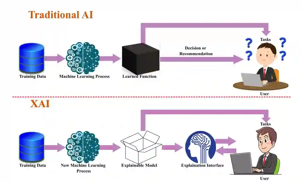 图1显示了传统AI和基于XAI的系统所涉及的操作的一般顺序。在传统的人工智能系统中,最终用户无法解释学习过程,它看起来像一个不透明的黑盒子。与传统AI不同的是,XAI模型使用革命性的ML过程和可解释的模型,在学习过程和根据训练数据做出的决策中为最终用户提供可持续的透明度。