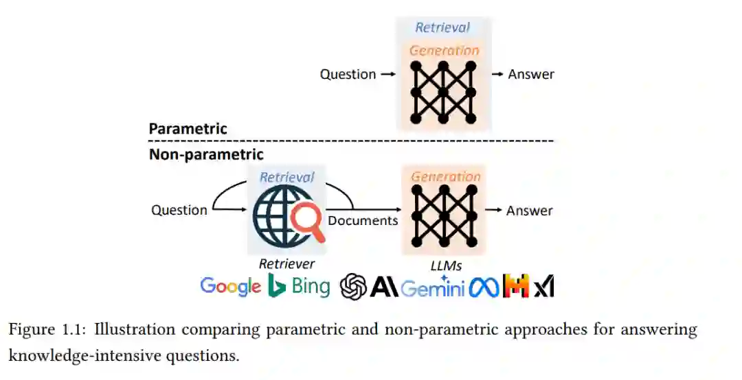 参数化方法提供了一个简单的接口,但它们存在幻觉问题,并且无法访问实时的外部信息。在论文的第二部分中,我们重点关注通过非参数化数据存储扩展LLMs的非参数化方法,这通常由一个文档语料库和一个检索器构建。标准的检索增强生成(RAG)流程包括基于嵌入的检索器和基于LLM的生成器,通常需要单独的训练程序,并且往往受限于检索器的性能。我们引入了一种将检索与生成融合在单个变换器中的端到端解决方案,并直接使用注意力机制进行检索。为了解决需要详细回答的复杂问题,我们引入了Active RAG,它在生成过程中动态和主动地检索信息。最后,我们通过比较和调和两种范式并提供对未来方向的见解来总结我们的研究。