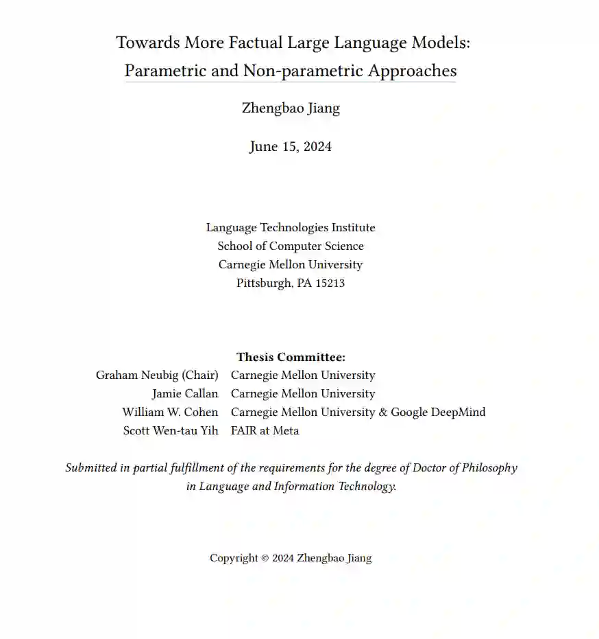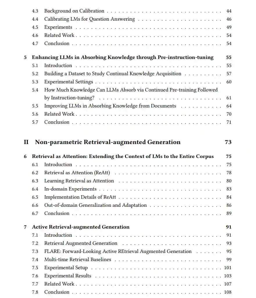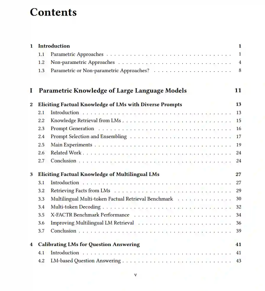 大型语言模型(LLMs)在帮助人们获取信息方面越来越重要,从“世界上最大的冰盖在哪里”这样简单的事实性问题到需要获取实时信息和推理的复杂问题,如“计划一次迈阿密的度假”。有两种处理需要事实知识的问题的范式:参数化方法将知识存储在LLMs的参数中,并通过提示来引出这些知识;非参数化方法将知识检索外包给外部的非参数化数据存储。在本论文中,我们旨在研究、比较并增强这两种范式的能力。 由于LLMs通过在多样的语料库上进行预训练,已经在其参数中积累了大量知识,因此可以在被提示提问时直接生成答案。在论文的第一部分中,我们重点关注利用LLMs参数中包含的事实性知识的参数化方法。我们首先研究通过组合从不同提示中得出的多种预测来提取更多知识的方法。然后,我们校准LLMs,使其在回答超出其知识范围的问题时变得更加可信。我们发现,即使LLMs完全记住文档并能够逐字复述它们,仍然常常无法回答有关这些文档的问题。为了增强LLMs从文档中吸收知识的能力,我们提出了在预训练文档之前进行问题回答任务教学的预指令调整方法。