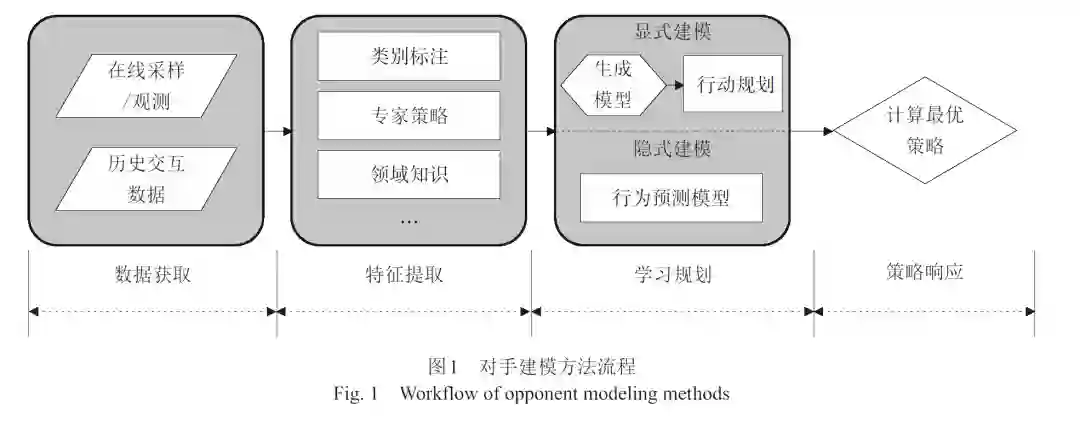 如何在合作、竞争的复杂任务场景中自主决策是当前人工智能领域所要解决的关键问题。在游戏人工智能、军事仿真、自动驾驶、机器人集群控制等应用场景的多智能体系统中,智能体具有感知、记忆、规划、决策、交流、行动等许多能力,其中对其他智能体行为、意图、信念等的推理十分重要。在此过程中,智能体往往需要通过观察其他智能体,建立除自身以外的其他智能体抽象模型,推理其行为、意图、信念等要素,并用于辅助自身决策,此过程涉及到的方法被称为对手建模(opponent modeling, OM)。对手建模不仅关注竞争场景下的敌方智能体建模,而且还考虑合作场景下的友方建模,因此,有些文献又称其为建模其他智能体。从理论上讲,完全理性的智能体能够做出当前条件下的最优策略,实现收益的最大化。然而,现实情况下的智能体通常只具有有限程度理性[1],决策受到情绪、偏好等影响,往往以“满意”作为收益标准。此外,基于规则的智能体,如产生式规则、启发式算法等[2-4],遵循预置规则机制,行为模式僵硬、易于预测、理性程度不足,对手建模技术使智能体能够快速适应对手的行为方式并且在对抗中利用其弱点获取更高收益,或在合作中使团队获得更大回报。现有的对手建模方法如策略重构、类型推理、意图识别、递归推理等方法[5],具有模型可解释、认知推理层次深的特性。然而,要进一步应用于贴近现实的问题场景仍然存在动态环境适应性弱、特征选取复杂、状态空间表示能力不足、方法在规模上的可扩展性不强等诸多缺陷。针对以上不足,研究者们将以深度Q网络(deep Q network, DQN)[6]为代表的深度强化学习算法(deep reinforcement learning, DRL)引入到对手建模领域。其中,强化学习是智能体学习如何与环境交互,达到最大化价值和最优策略的自主决策算法。深度学习则能够从高维感知数据中提取抽象特征,对复杂的价值函数和策略函数具有很强的拟合能力。DRL有机地结合了深度学习与强化学习,前者能够增强感知与表达能力,后者提供最优决策能力,使基于DRL的对手建模(DRL-OM)技术对复杂环境中其他智能体具有更好的认知能力,目前已在德州扑克[7-8]、星际争霸II[9]等多智能体问题场景取得优异的表现。DRL-OM是DRL方法在对手建模应用中的研究分支,涉及人工智能、神经科学、认知心理学、博弈论等众多领域。有别于以往的对手建模方法[10],DRL-OM研究涉及更复杂的应用场景、更多元的领域交叉,在问题特性、建模方式、应用场景上和传统方法具有较大差异。虽然许多现有文献[11-12]将对手建模领域的已有研究进行了汇总分类,但目前尚没有将基于DRL方法的对手建模进行系统研究的综述文章。此外,有关多智能体强化学习的综述研究[13-14]也阐述了对手建模的应用,然而它们的内容普遍较少涉及对手建模原理,也没有系统地分类和总结对手建模方法。随着DRL越来越广泛地应用在对手建模中,领域内涌现出许多崭新的理论和方法,远超现有文献总结的涵盖范围。因此,本文将DRL算法作为研究出发点,基于对手的理性程度和建模机理提出不同于现有文献[11-12]的对手建模分类标准。此外,对手建模技术的更新迭代为现实应用提供了机遇和挑战,为此,本文汇总归纳了DRL-OM方法在应用领域的相关研究工作。