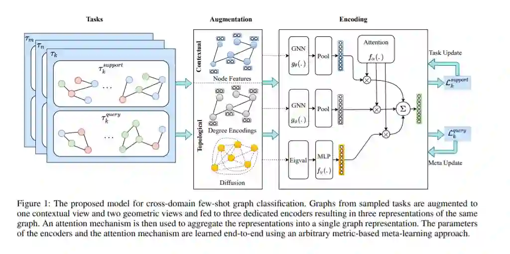我们通过引入三个新的跨域基准来研究具有非等效特征空间的跨域少样本图分类问题。我们还提出了一种基于注意力的图编码器,该编码器使用三个一致的图形视图、一个上下文视图和两个拓扑视图,学习任务特定信息的表示,以便快速适应,以及任务无关信息的表示,以便进行知识迁移。我们进行了详尽的实验来评估对比学习策略和元学习策略的表现。我们发现,当与基于度量的元学习框架相结合时,所提出的编码器在所有基准测试中都获得了最佳的元测试平均分类精度。源代码和数据将在这里发布:https://github.com/kavehhassani/metagrl