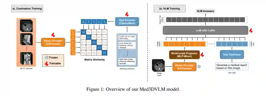 视觉-语言模型(VLMs)在二维医学图像分析中已展现出潜力,但将其扩展到三维领域仍面临挑战,主要源于体数据的高计算需求以及三维空间特征与临床文本的对齐困难。为此,我们提出Med3DVLM——一种通过三项关键创新解决这些难题的三维视觉-语言模型: 1. DCFormer编码器:采用分解式三维卷积的高效架构,可规模化捕捉细粒度空间特征; 1. SigLIP对比学习策略:基于成对Sigmoid损失的训练方法,无需依赖大批量负样本即可提升图文对齐效果; 1. 双流MLP-Mixer投影器:融合图像多层次特征与文本嵌入,生成更丰富的多模态表征。