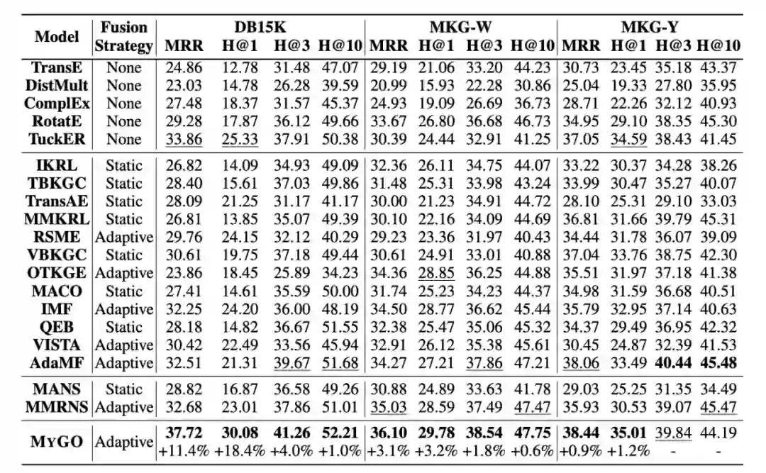 首先,我们可以发现MyGO在所有评估指标上都优于所有基线方法,在两个数据集上取得了新的一流性能。结果表明,自适应 MMKGC 方法普遍优于静态方法。同时,与其他自适应方法不同的是,MyGO采用了更精细的特征处理,并通过模态标记化和分层三重建模进行融合。由于现有方法往往只为每种模态设置一个特征(嵌入向量),MyGO通过对现有原始数据进行标记化来获取更多细粒度特征,并通过与 HTM 中基于变换器的编码器进行细粒度交互式融合来提高模型性能。 此外,横向比较各个指标的改进,我们可以发现MyGO在Hit@1和MRR上的改进明显高于Hit@10和其他指标。例如,在DB15K上,MyGO在Hit@1上提高了18.4%,但在Hit@10上只提高了1%。这凸显了MyGO通过其复杂的设计显著提高精确推理能力的能力。