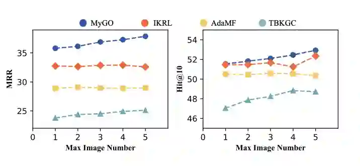 我们进行了在多张图片下的MMKGC实验,通过保留不同数量的图像来评估模型对图像信息的利用能力。上图中描述的结果突出表明,与其他基线相比,MyGO即使在面对越来越多的多模态数据时,也能实现令人印象深刻的性能提升,因为MMKGC的性能呈现出明显的上升趋势。相反,基线性能则有些不稳定,会随着图像量的增加而出现波动,整体效果与MyGO并不匹配。我们将这一现象归因于不同方法处理模态信息的方式不同。当前的模型通常会从实体的多个原始数据中生成特定模态的嵌入向量,从而丢失了初始特征的基本原始信息。然而,MyGO通过模态标记化设计将信息处理成细粒度的语义单元,保留了最经常出现的成分。通过这种技术,MyGO掌握了即使特定模态数据量扩大,也能保留模态中一般和统一信息的能力,使我们的方法更具稳定性和可扩展性。