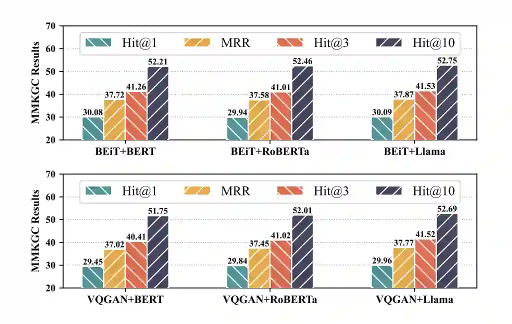 为了进一步探索MyGO对不同标记符的鲁棒性,我们在 DB15K 上使用了更多种类的视觉分词器(BEiT 和 VQGAN)和文本分词器(BERT、RoBERTa 和 Llama)。 图中展示了 MMKGC 及其组合的结果。我们可以得出结论,MyGO在不同的标记符号化器中都是稳定而稳健的,这表明MyGO是一个可通用的通用框架,可以整合不同的多模态骨架。此外,我们还可以发现,像 Llama这样的大模型可以带来更好的性能,这证明了我们的方法与最新的 LLM 技术相结合的可能性。