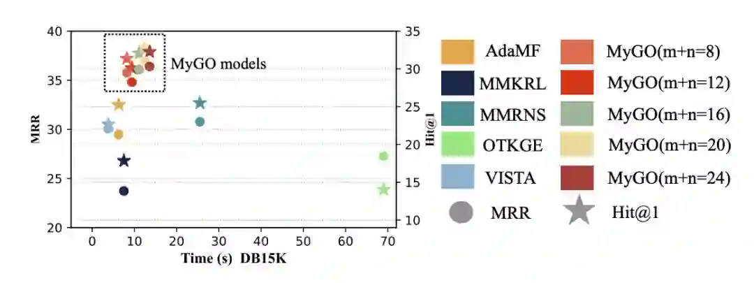 为了验证MyGO的效率,我们进行了一次效率实验。如图所示,我们将MyGO在不同的和条件下的训练效率和最终预测结果与最近的几种基线进行了比较。我们发现,MyGO在保持相对较好的效率的同时实现了最好的性能,实现了性能和效率之间的权衡。此外,我们还可以观察到,代币总量()对效率的影响很小。当 从 8 个增加到 24 个时,MyGO 的效率从大约 8s 上升到大约 13s,这在实践中还是可以接受的。